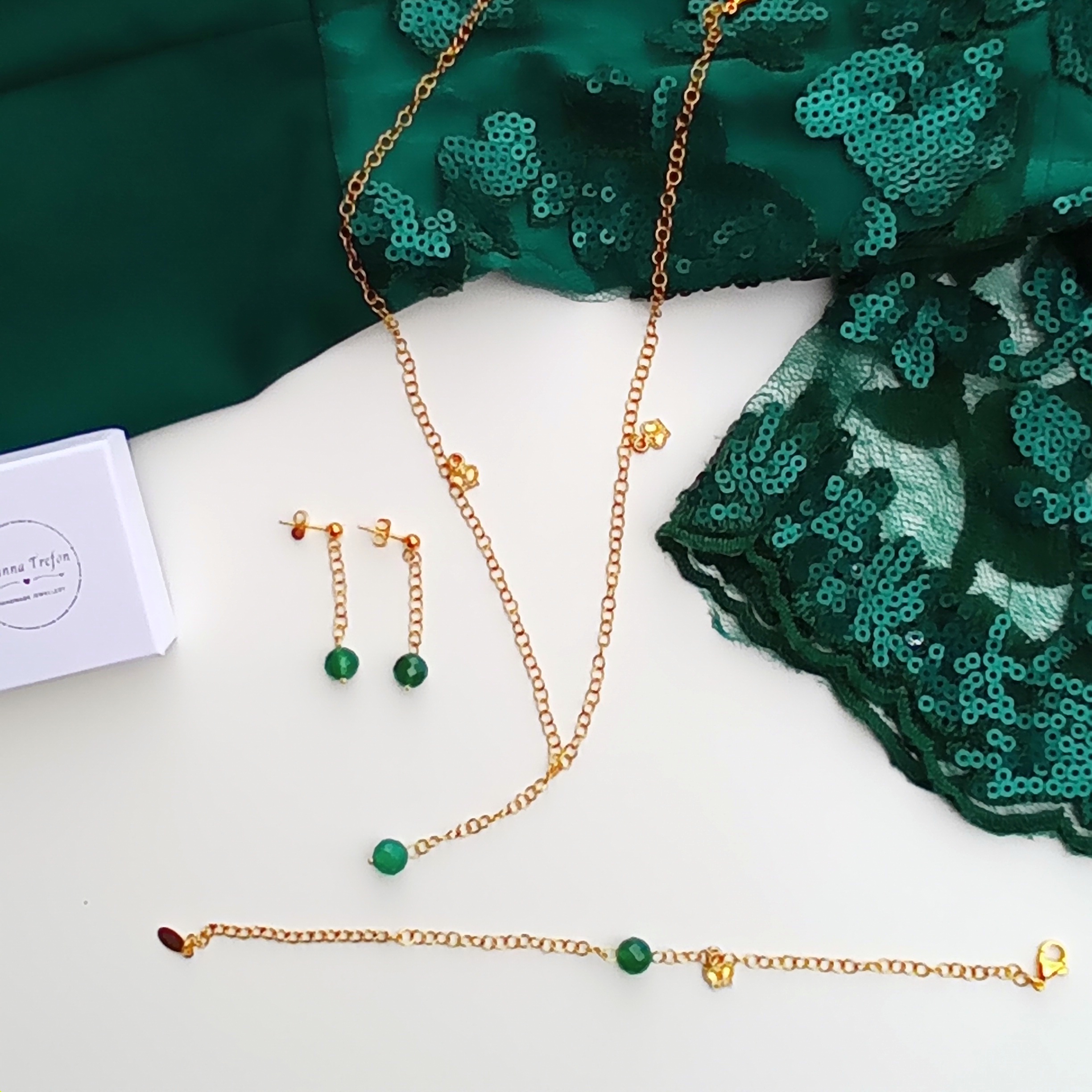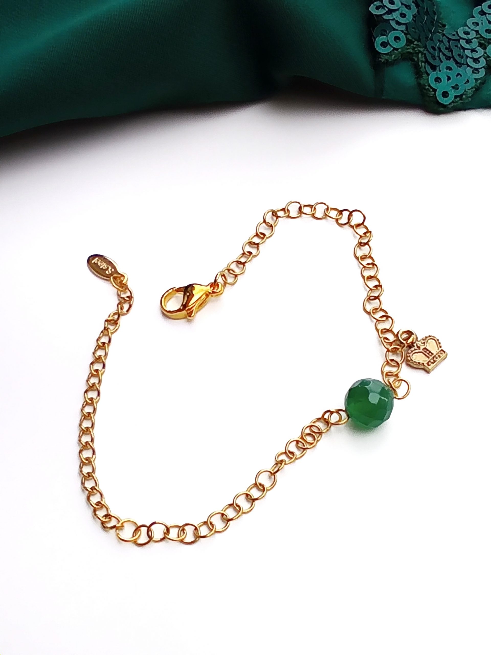 Bransoletka w minimalistycznym stylu ze stali chirurgicznej w kolorze złotym. Na środku wszyty jest agat w kolorze zielonym, a z boku doczepiona mała zawieszka w kształcie korony. Bransoletka niezwykle delikatnie podkreśla nadgarstek i prezentuje się bardzo elegancko. Zielony agat w połączeniu ze złotem stali pasuje świetnie do musztardowych kreacji lub szarych marynarek.