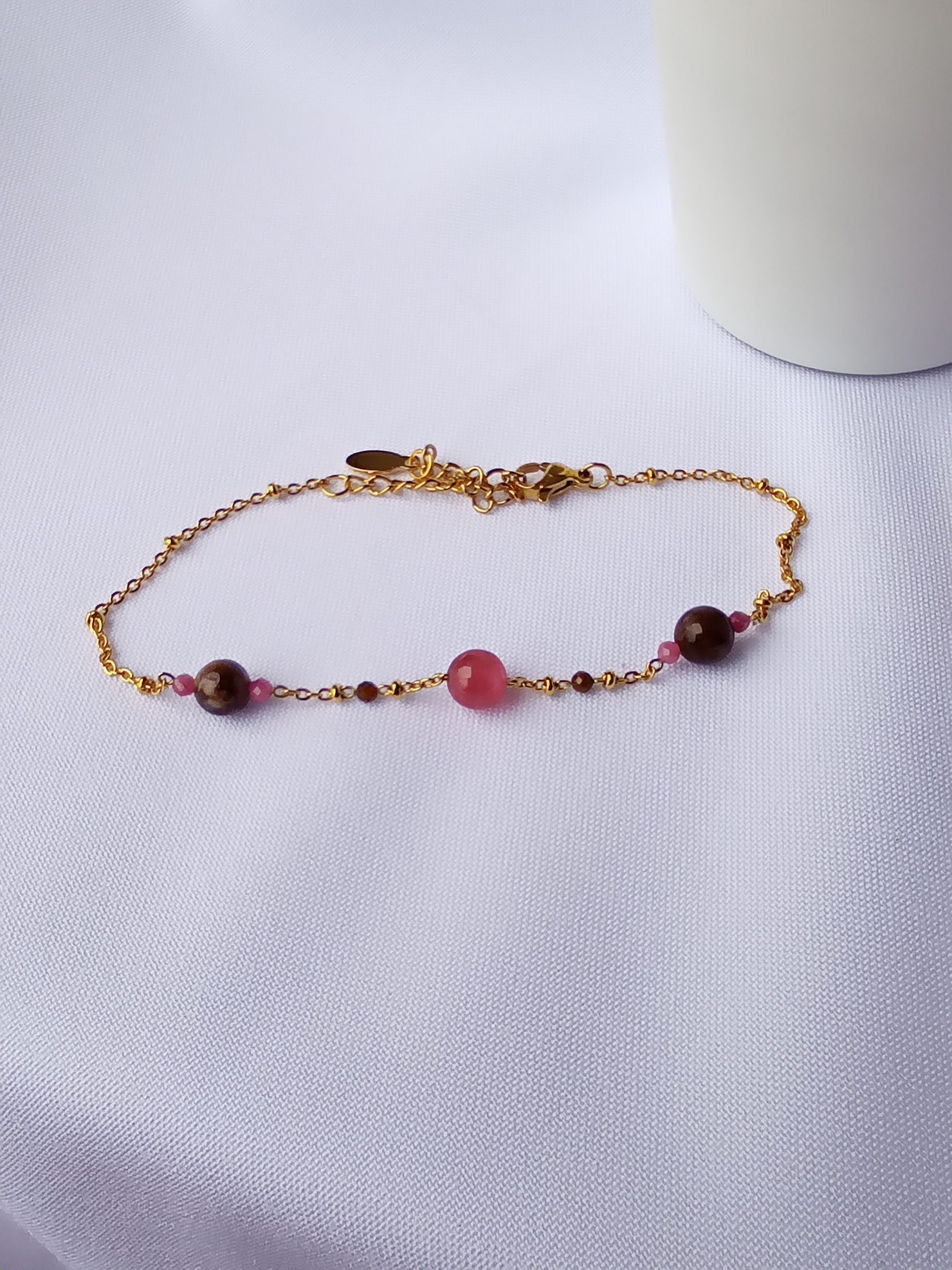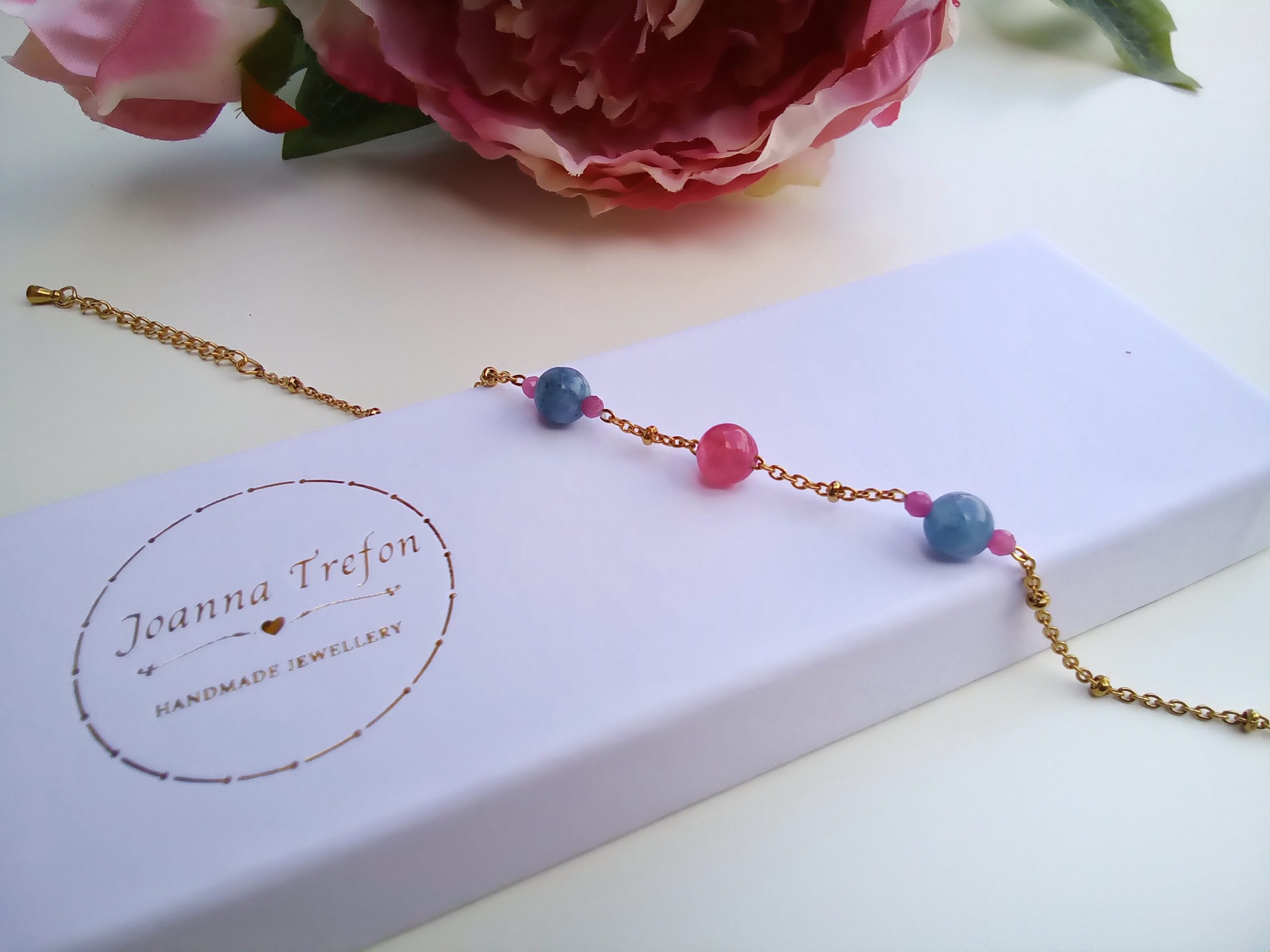 „Turmalinova” złożona jest z trzech turmalinów wielkości 8 milimetrów oraz czterech malutkich, dwumilimetrowych, wszytych w łańcuszek w kolorze złotym. Bransoletka jest delikatna, a przy tym niezwykle efektowna. Na nadgarstku prezentuje się bardzo elegancko, dodając wdzięku i uroku swojej właścicielce. Łańcuszek ze stali chirurgicznej z małymi kuleczkami może być używany przez osoby uczulone na nikiel i inne metale. Przedłużka zapewnia możliwość regulacji oraz dopasowania do nadgarstka.
