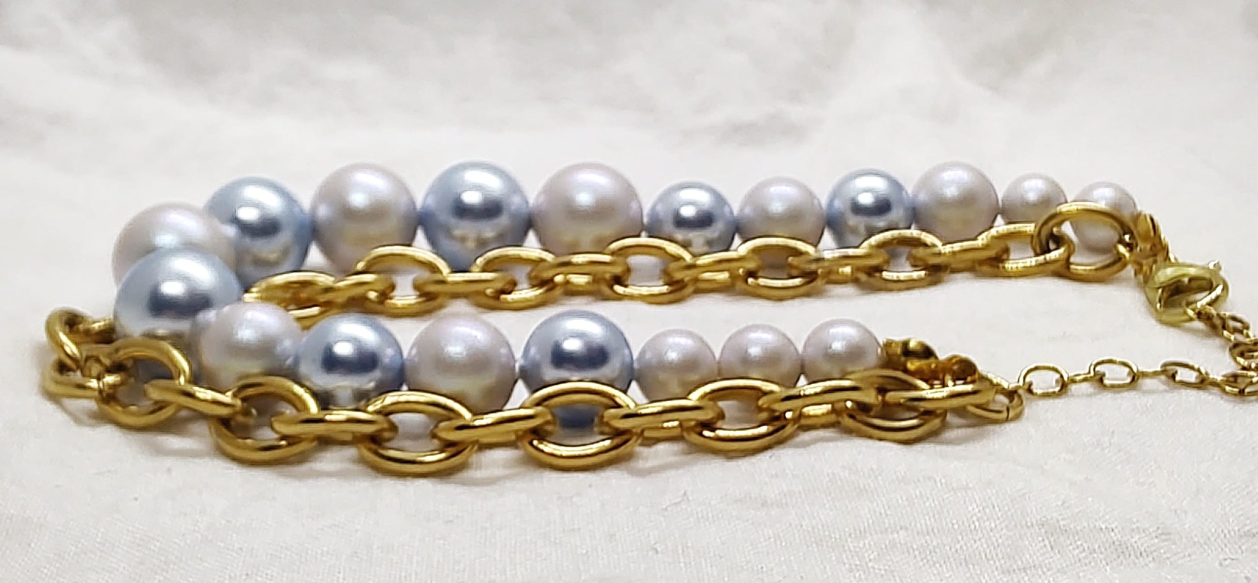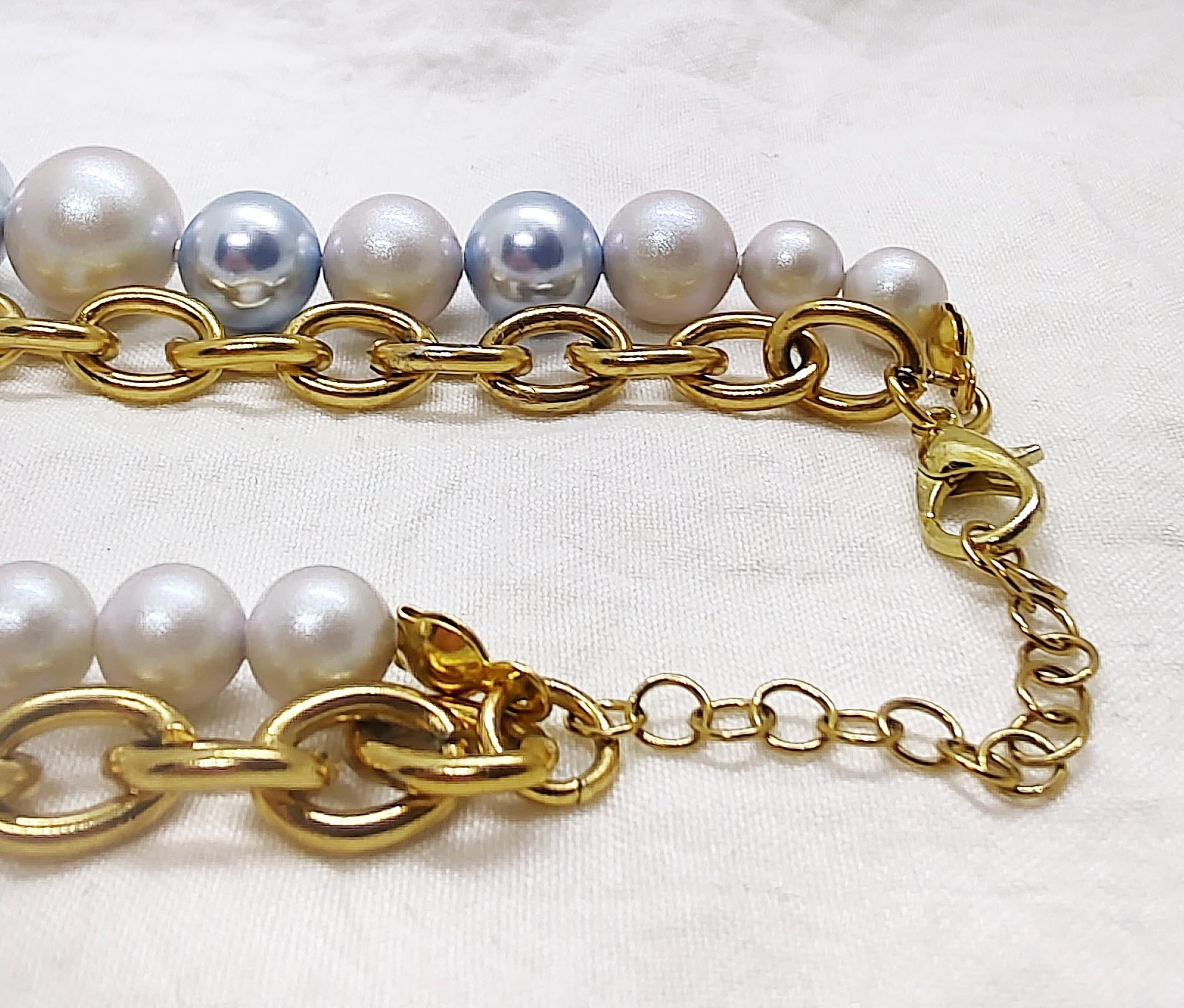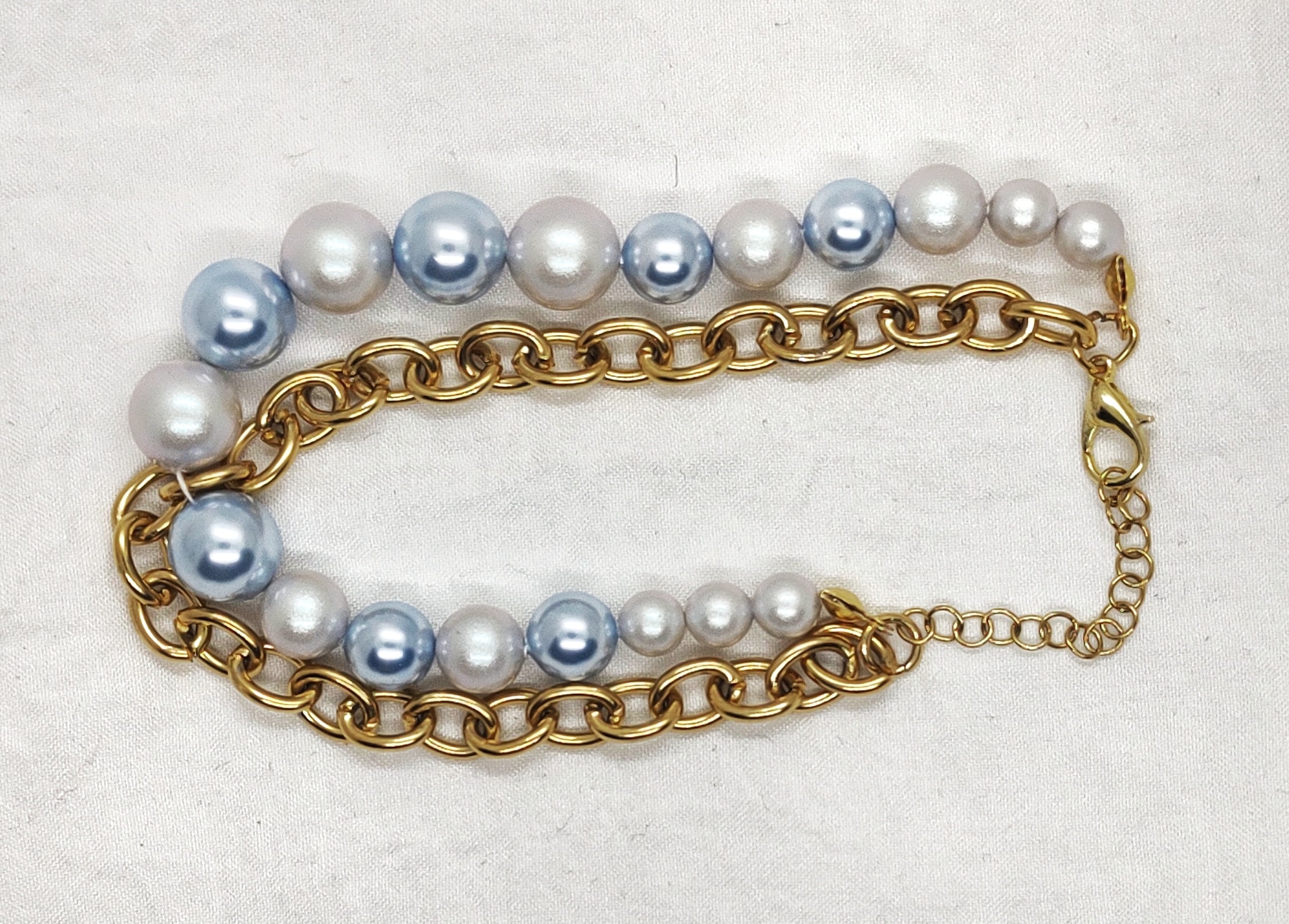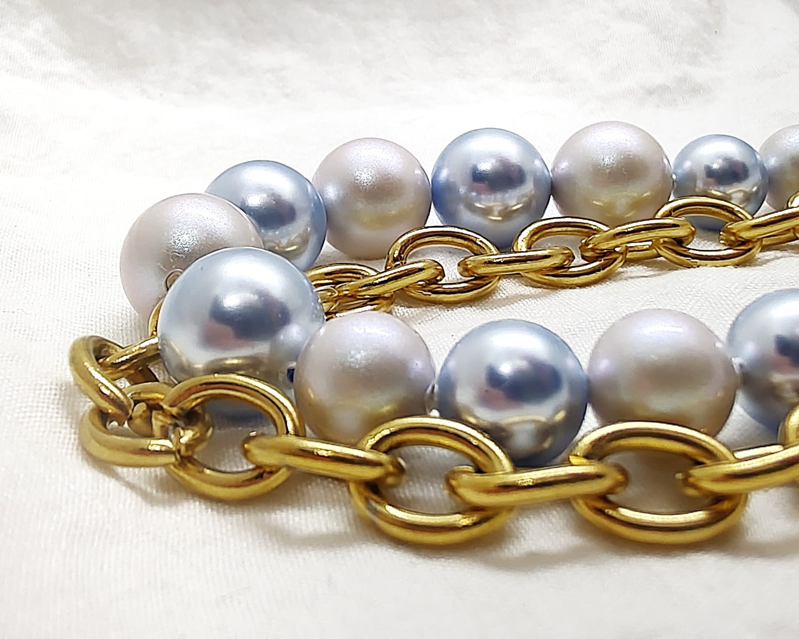 Bransoletka, składający się z dwóch części: łańcucha z dużymi ogniwami i sztucznych pereł firmy S. Elegancki, idealny na co dzień i wielkie wyjścia. Perły w kolorach błękitnym i srebrnym w aksamitnym wykończeniu, łańcuch ze stali chirurgicznej w złotym kolorze.