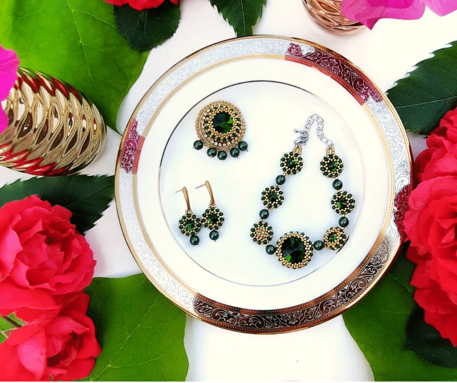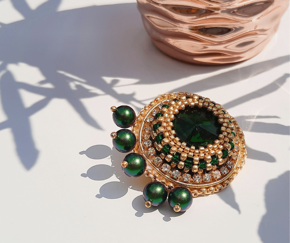 Broszka w kolorze złoto-zielonym, z centralnie ułożonym kryształkiem rivoli, który okalają cyrkonie, mieniące się przy każdym ruchu. W dolnej części znajduje się pięć pereł Znanej Firmy S., w kolorze złoto-zielonym, dzięki czemu broszka przypięta do szala czy jednolitej bluzki podkreśla klasyczny i elegancki wygląd każdej dojrzałej kobiety. Pasuje blondynkom i rudym, a gdy zaopatrzysz się w zestaw z kolczykami i bransoletką „Zielone Oczko”, będziesz lśniła pośród innych kobiet.