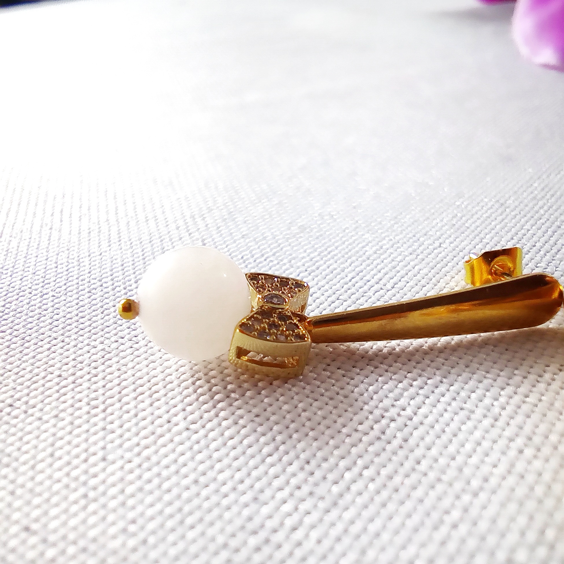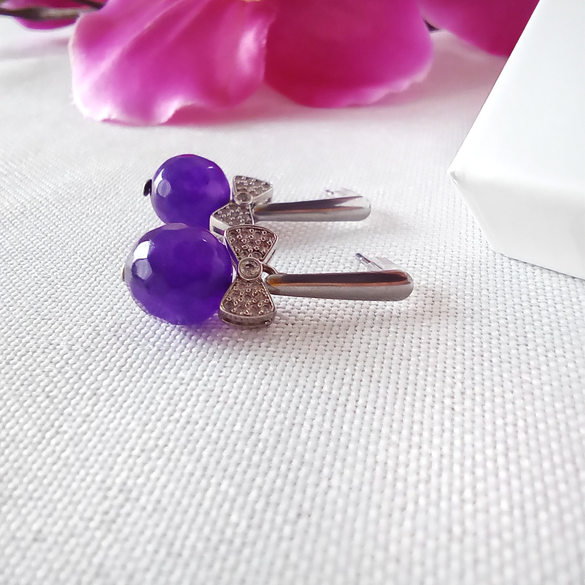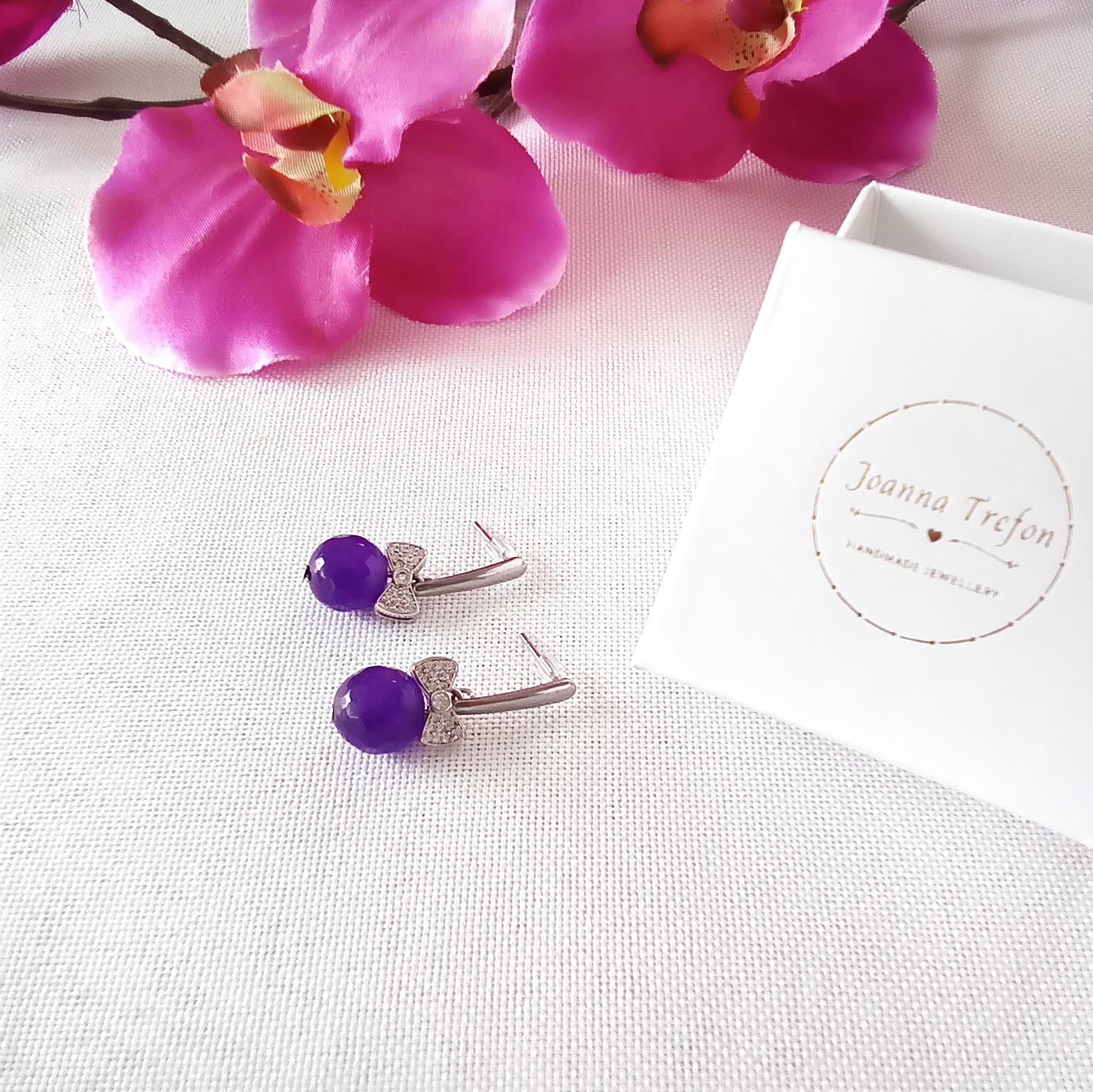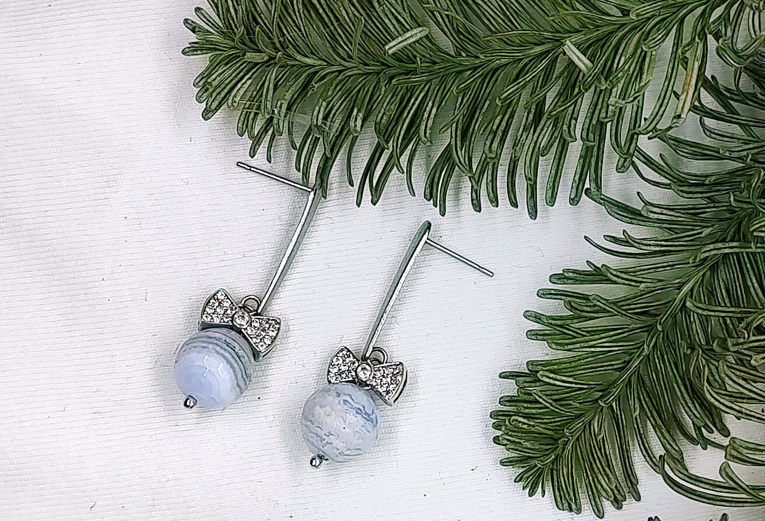 Kolczyki mają pośrodku kokardkę ze stali chirurgicznej w srebrnym lub złotym kolorze – do wyboru. Kokardka wysadzana jest malutkimi kryształkami, które świecą się i podkreślają urok kolczyków. Pod kokardką znajduje się kamień naturalny – w wersji złotej mlecznobiały morganit, w wersji srebrnej – mocno fioletowy agat lub szaroniebieski chalcedon.