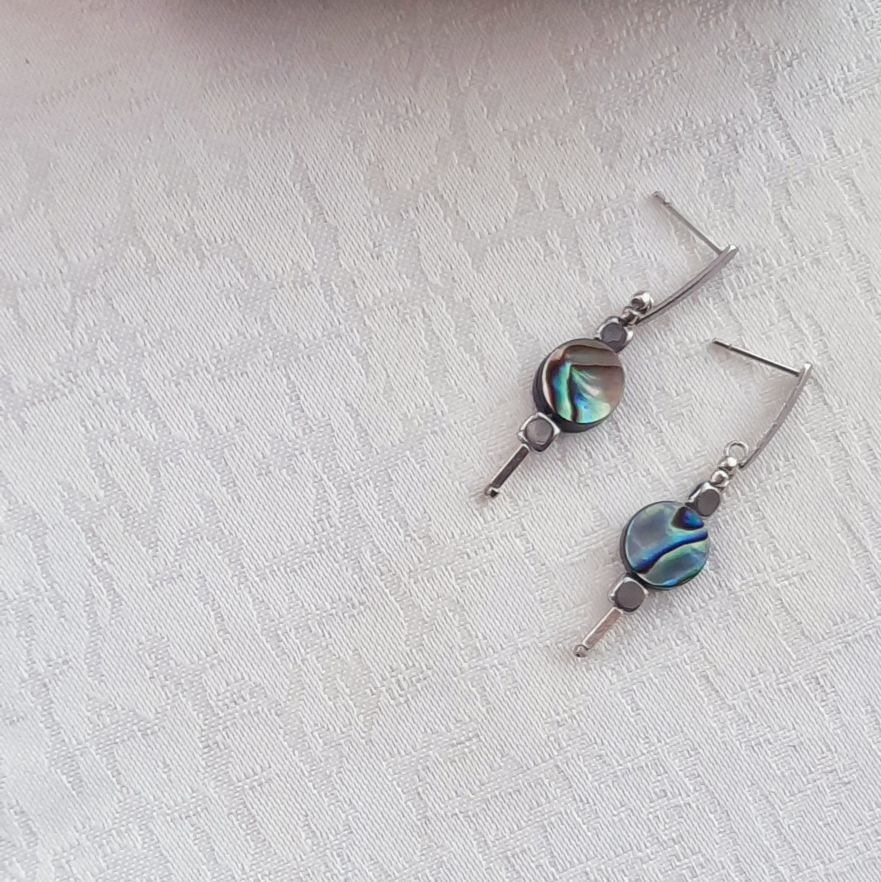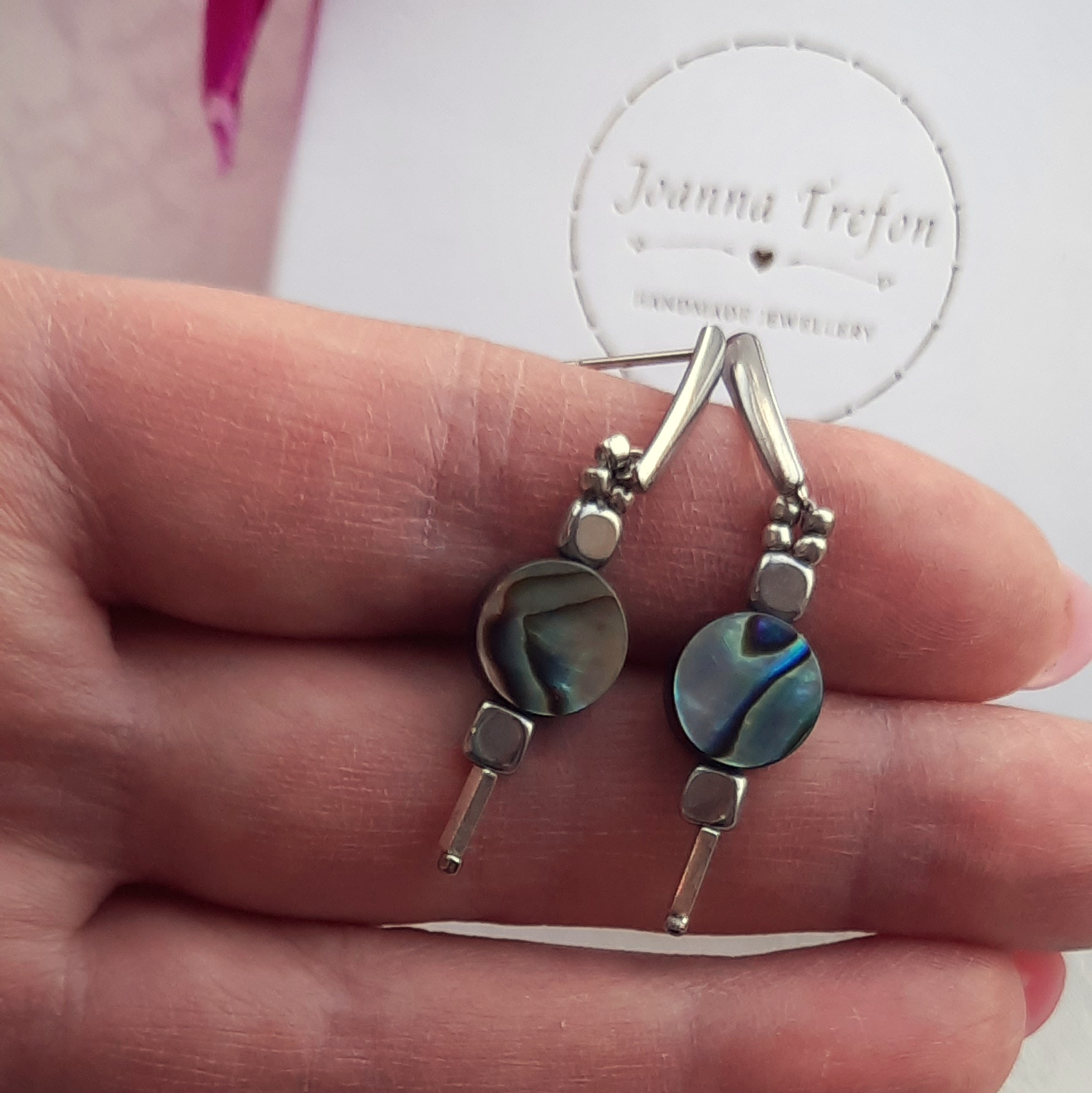 Kolczyki z muszlą abalone i hematytami w srebrnym kolorze: rurki i kostki, które są lekkie i delikatne. Muszla mieni się różnymi odcieniami, wzorami i kolorami. Idealnie sprawdzą się na dzień do jeansów, jak i do zwiewnej, lekkiej sukienki. Bedzie pasowała kobietom o chłodnym typie urody.