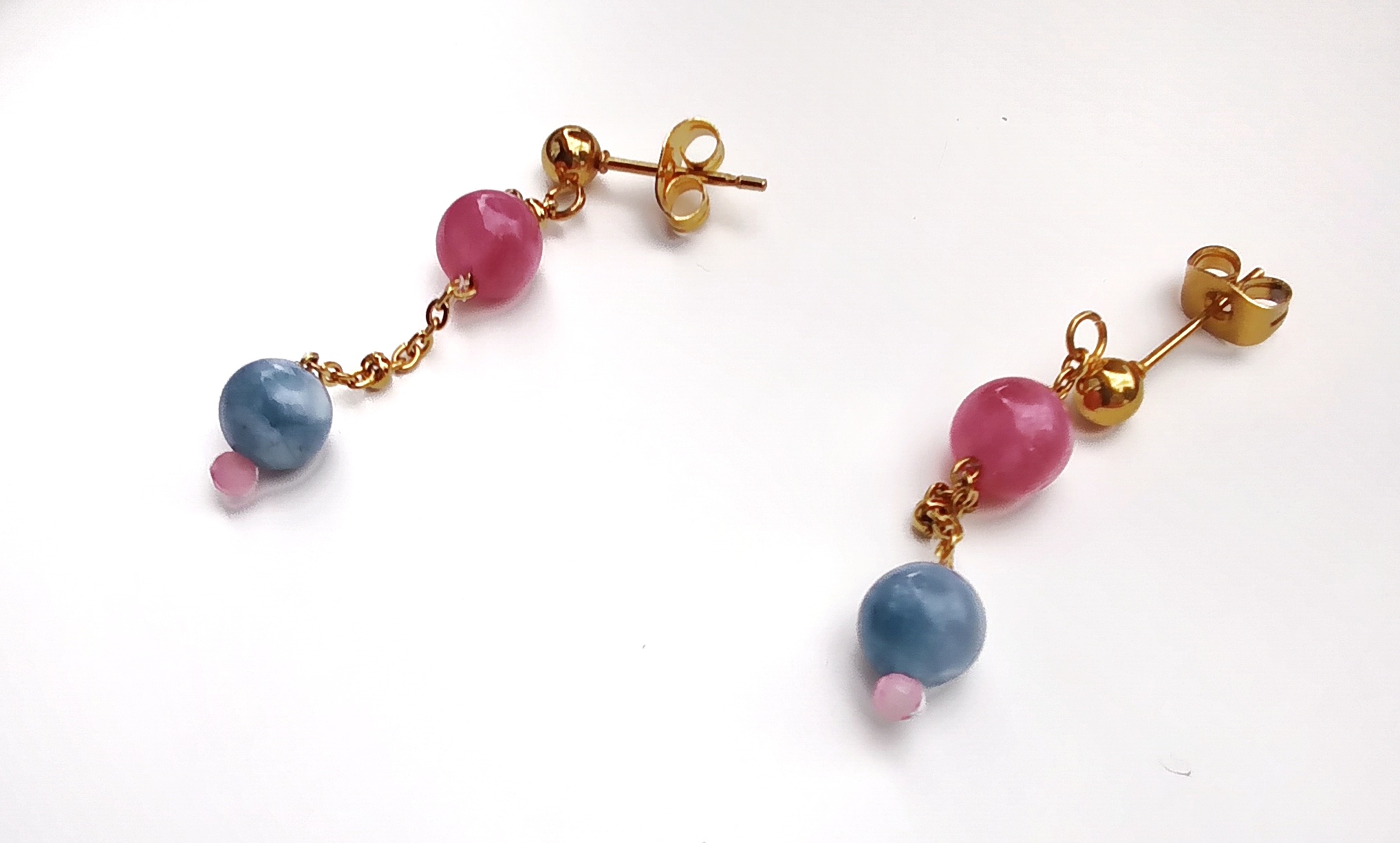 Kolczyki z dużymi i małymi kulkami turmalinów na łańcuszku ze stali chirurgicznej w kolorze złotym oraz sztyftem ze stali zakończonym małą kulką. Delikatne i eleganckie, idealnie wpasują się w biznesowy dress code, jak również w codzienne stylizacje. Turmaliny mają różne kolory (na zdjęciu przykładowe różowe i niebieskie), ale jest możliwość wyboru koloru kamieni.