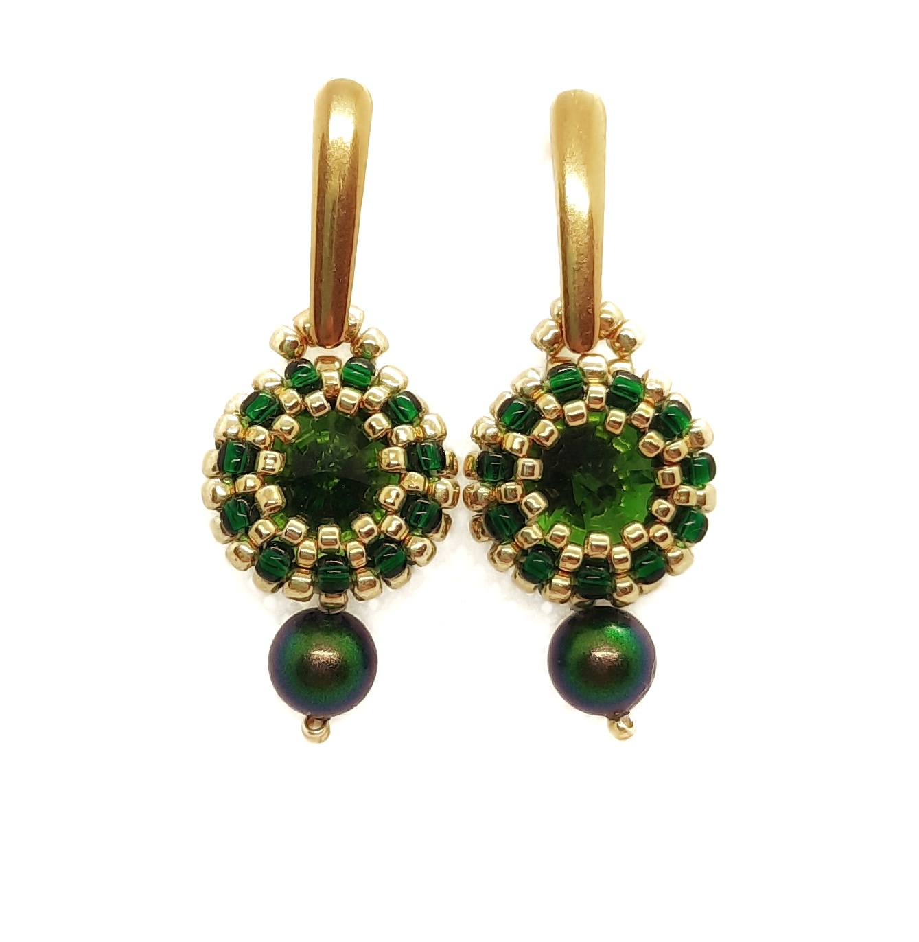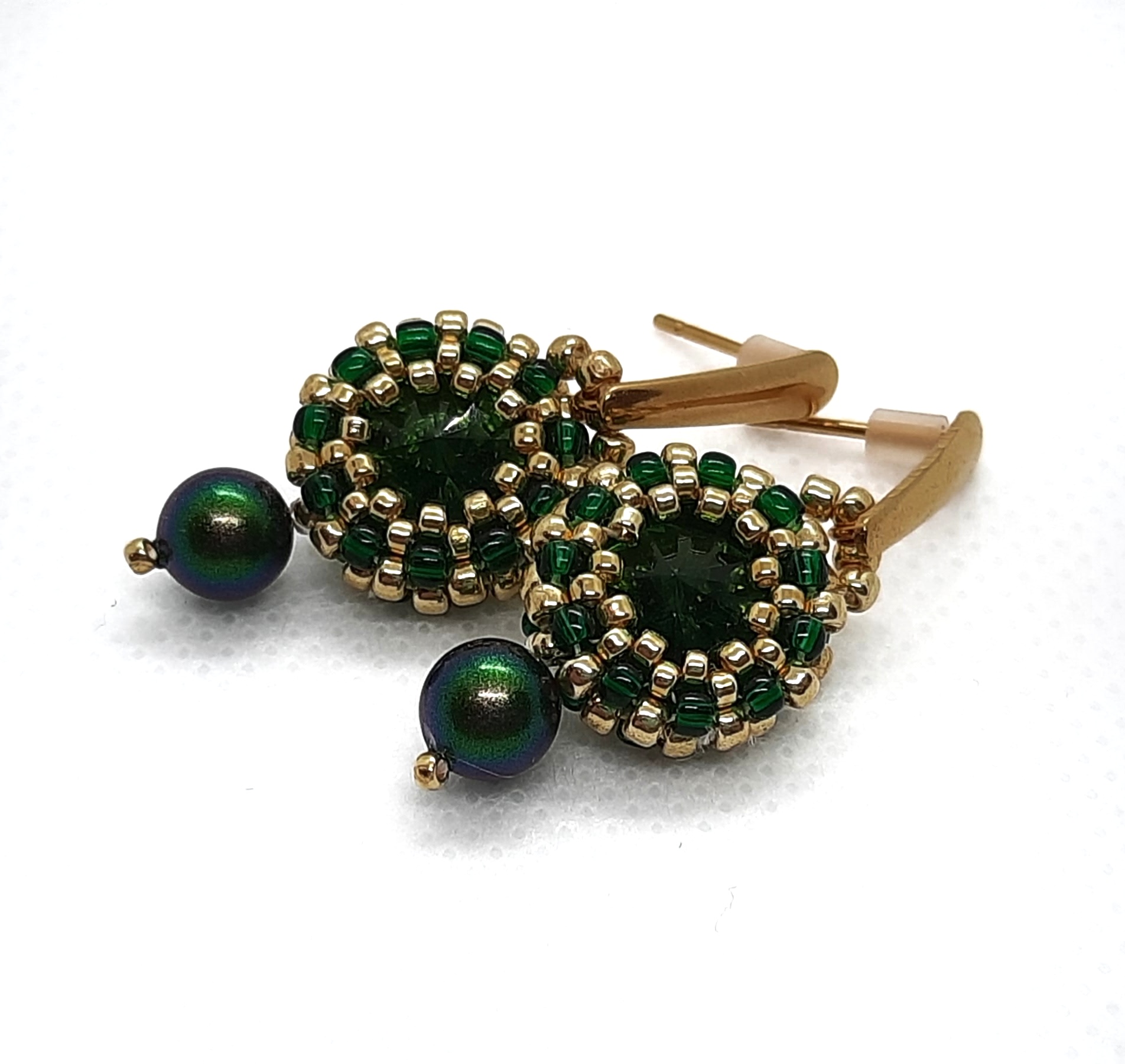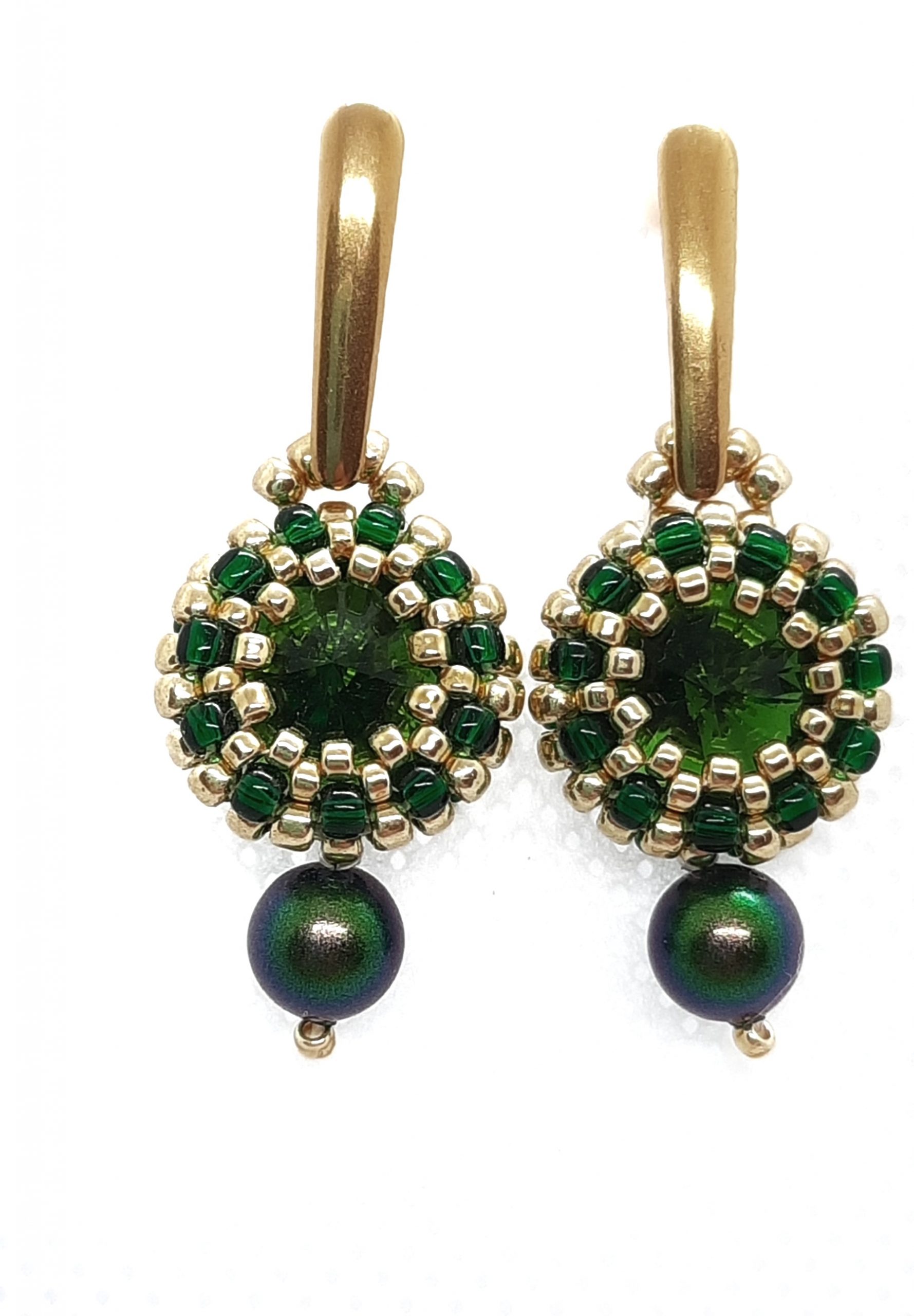 „Zielone oczko” to delikatne i niezwykle efektowne kolczyki z 10 mm rivoli w kolorze głębokiej zieleni i złoto-zielonymi koralikami. Wisienką na torcie jest perła w kolorze złoto – zielonym, podwieszona do kolczyka i sztyft – kropelka ze stali szlachetnej w kolorze złotym. Kolczyki są idealne na co dzień i od święta. To zdecydowanie jeden z Waszych hitów!