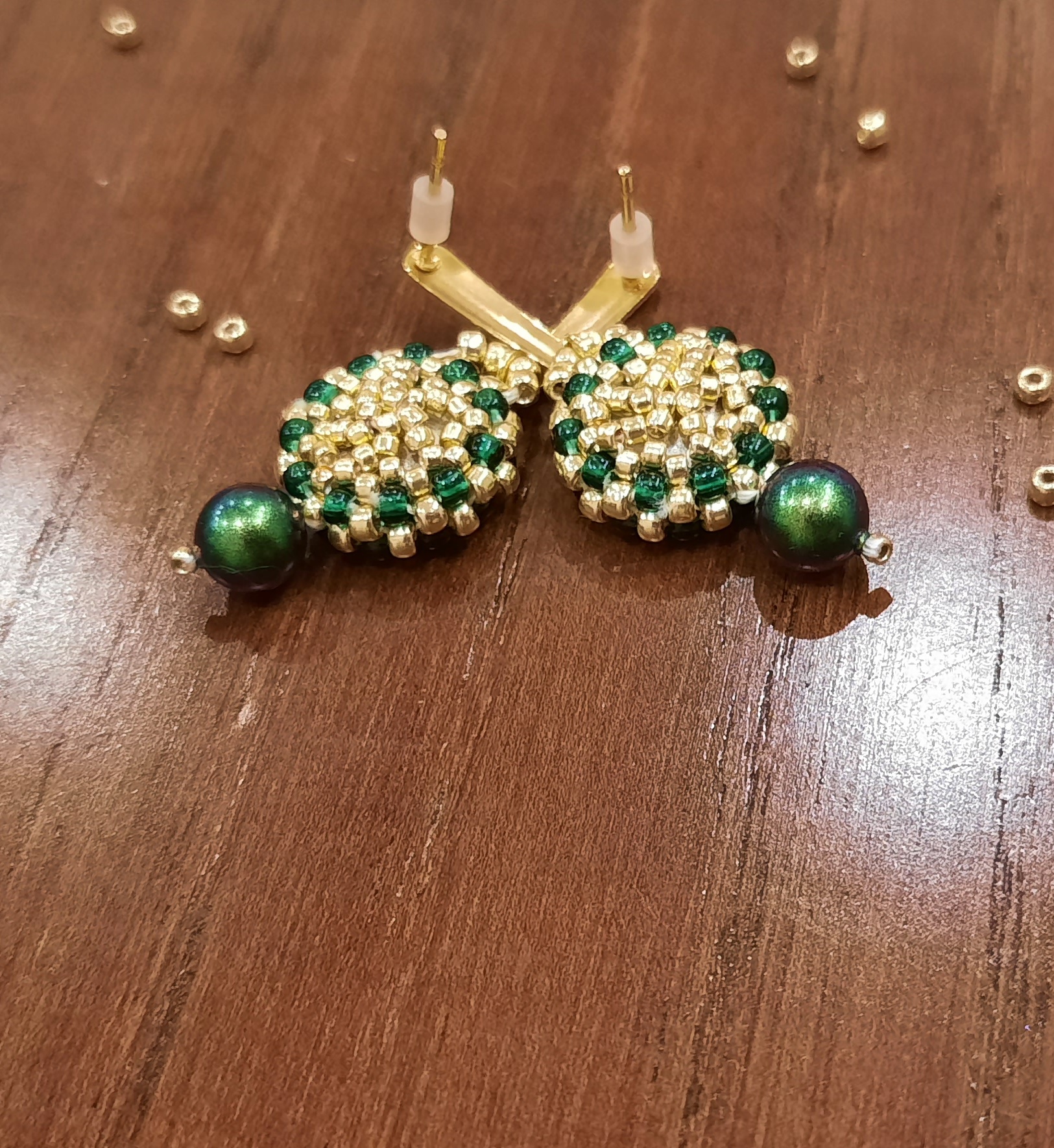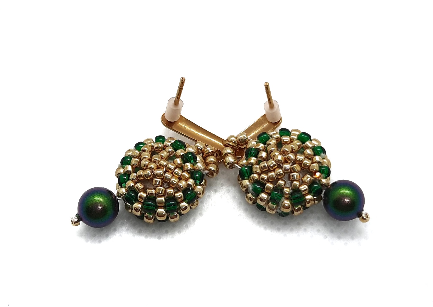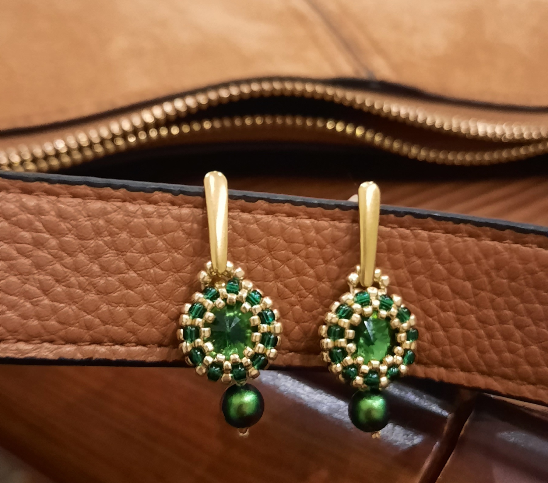 „Zielone oczko” to delikatne i niezwykle efektowne kolczyki z 10 mm rivoli w kolorze głębokiej zieleni i złoto-zielonymi koralikami. Wisienką na torcie jest perła w kolorze złoto – zielonym, podwieszona do kolczyka i sztyft – kropelka ze stali szlachetnej w kolorze złotym. Kolczyki są idealne na co dzień i od święta. To zdecydowanie jeden z Waszych hitów!