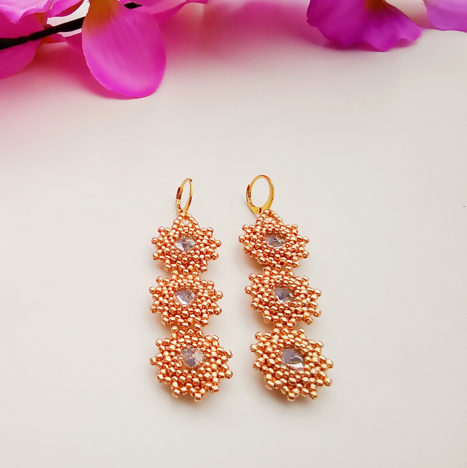 Długie kolczyki w kolorze rose gold i crystal, złożone z trzech części w kształcie kwiatków. Mienią się w zależności od kąta padania światła. Kolczyki pasują do sukni ślubnej i wieczorowej, a dla odważnych i pewnych siebie kobiet nawet do noszenia w ciągu dnia.