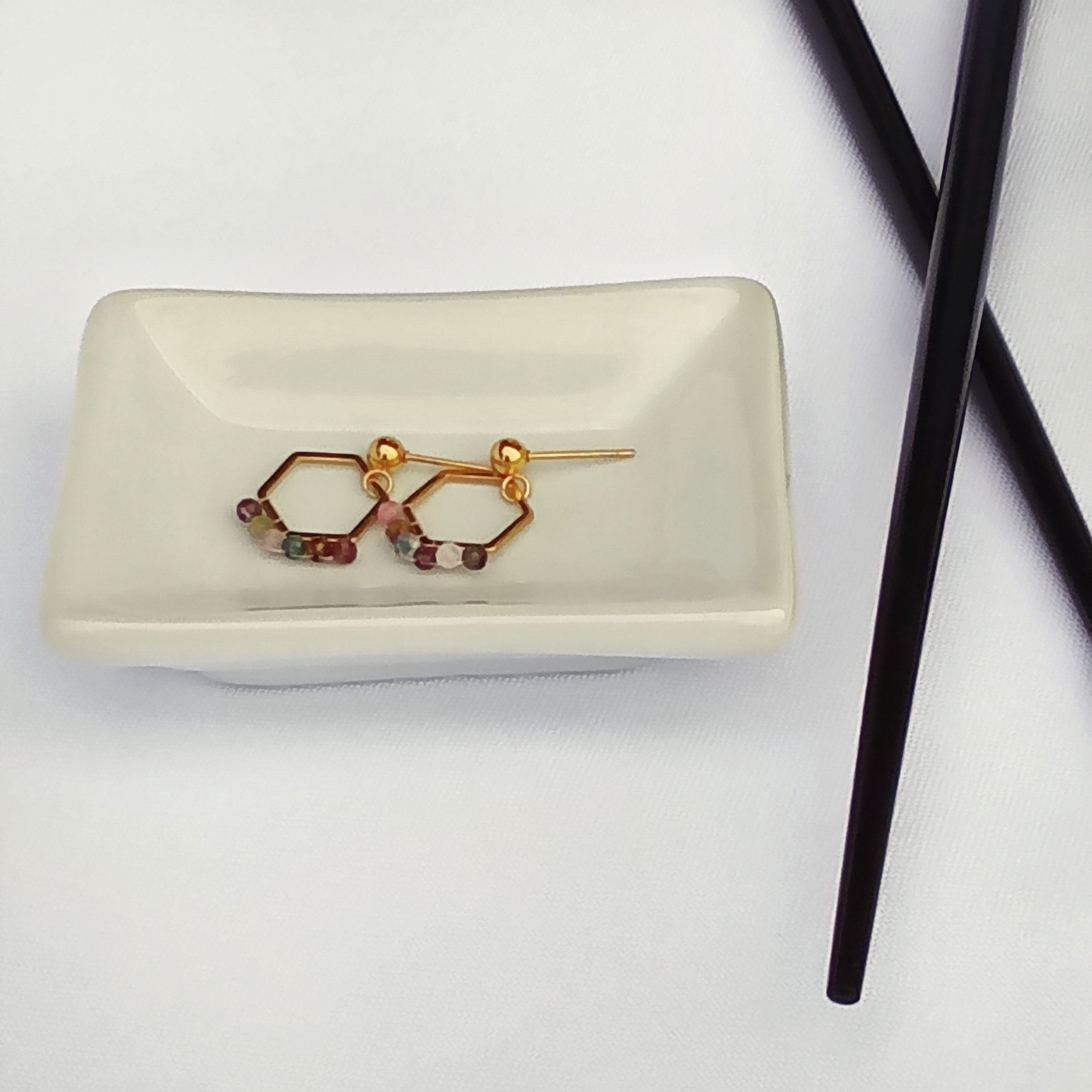Materiał: baza geometryczna ze stali chirurgicznej w kolorze złotym, turmaliny 2 milimetry.