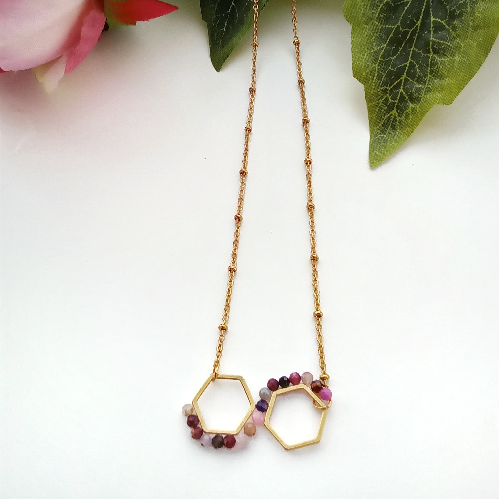 Delikatny i elegancki naszyjnik z turmalinami, który dzięki geometrycznym kształtom uwydatni Twój wdzięk. Geometryczne elementy są hitem tego roku i idealnie sprawdzają się nawet na biznesowych spotkaniach. Naszyjnik dyskretnie podkreśla dekolt, a wszyte ręcznie malutkie, dwumilimetrowe turmaliny dodadzą uroku i skomponują się z większością stylizacji dziennych i wieczorowych. Zastosowana w naszyjniku stal chirurgiczna w kolorze złotym stale zachowuje blask i jest antyalergiczna.