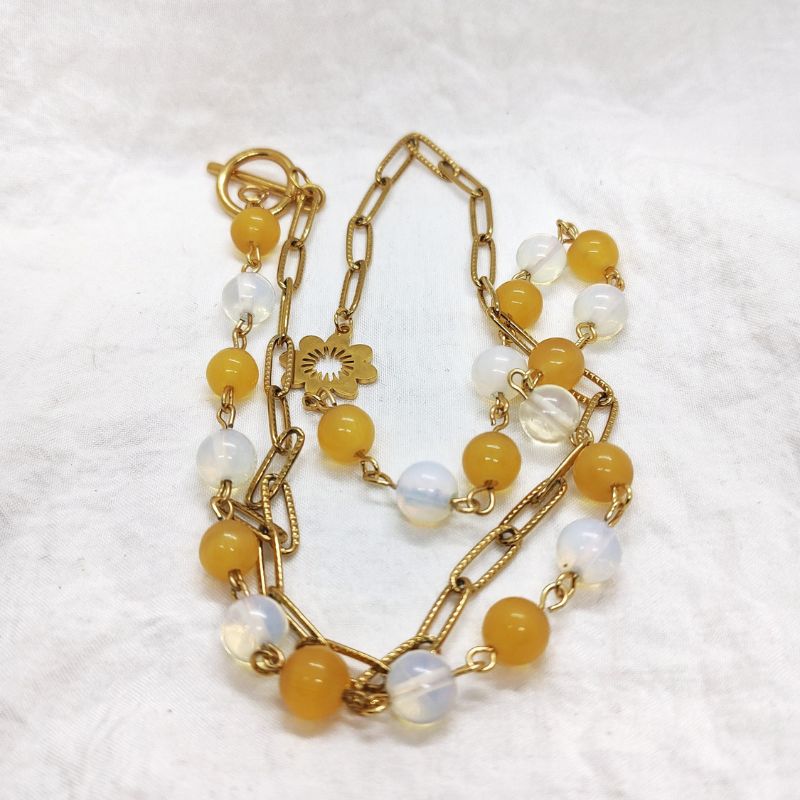 Naszyjnik z łańcucha ze stali chirurgicznej w złotym kolorze, przetykanym kulkami opalitów i żółtych uleksytów, mieniących się w świetle. Idealnie pasuje do grubych golfów i swetrów – zimą, a do bluzek na grubszych ramiączkach lub basicowych t-shirtów – latem. Zapięcie toggle dodaje elegancji, a kwiatek łączący łańcuch z rzędem kamieni podkreśli kobiecy charakter każdej z nas.
